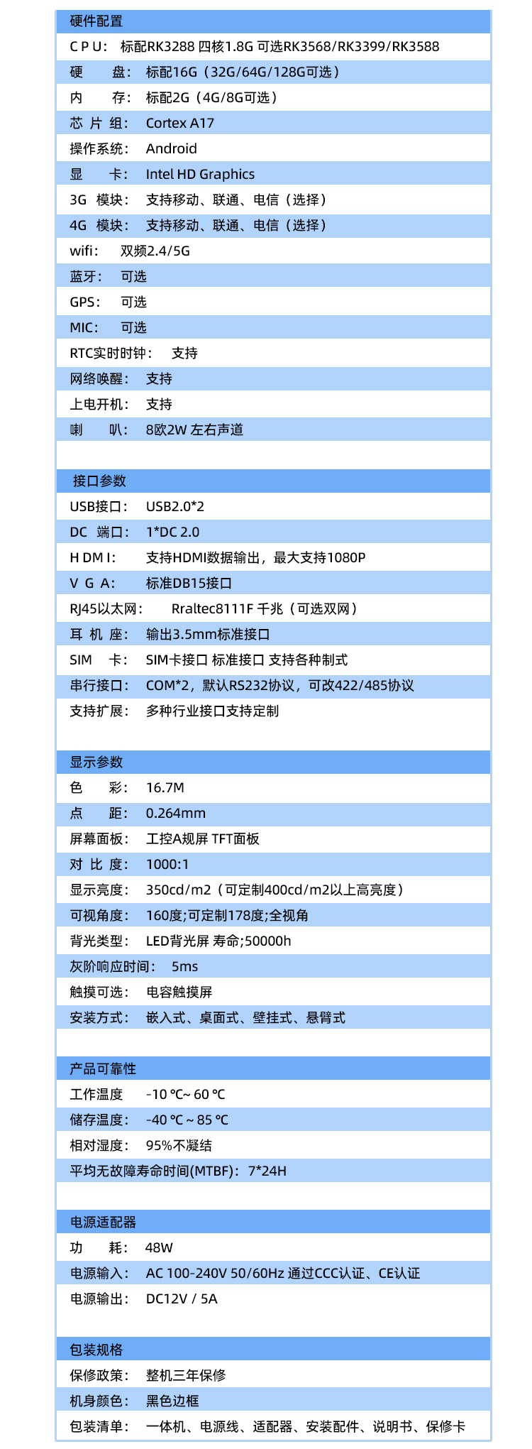 | CPU | 標配:RK3288 四核1.8G 可選RK3568/RK3399/RK3588 |